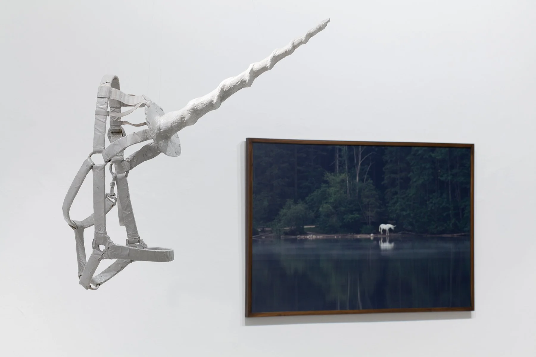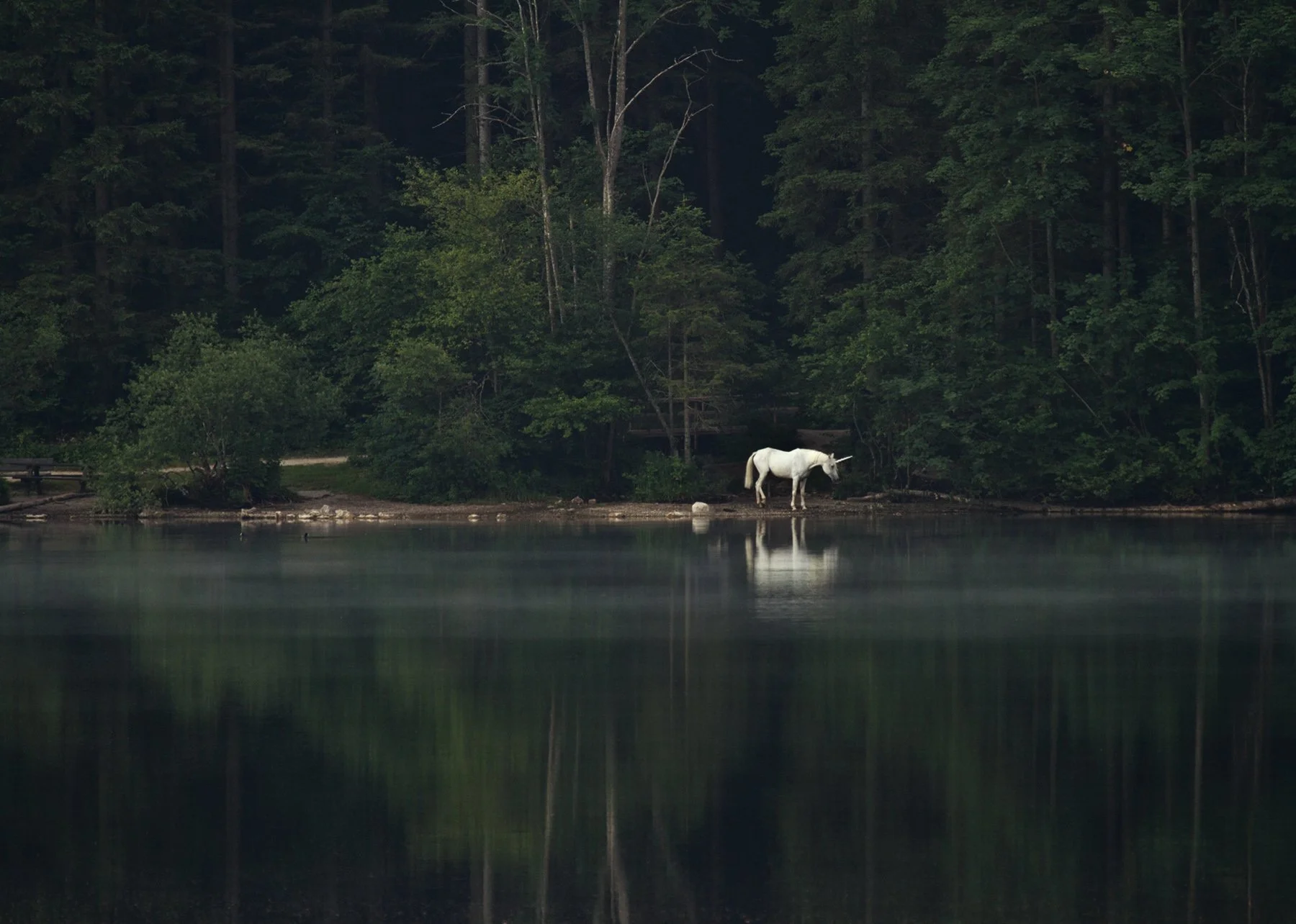 As a matter of desire takes was realised in Lunz am See in Austria. It takes up the city arms and the local unicorn legends of the touristic destination. A white horse was transformed into a unicorn with a prosthesis and appeared early on the bank of the Lake. As a subtle performance, the project should not be announced in advance, but sprinkle rumors in the city. The artificial-looking and surreal presence of the mythical creature seems to evoke locally desired realities.