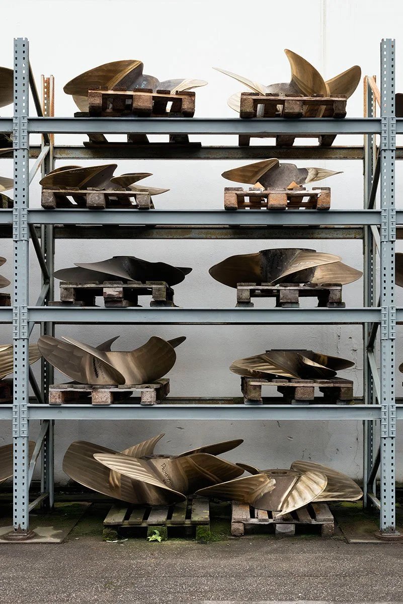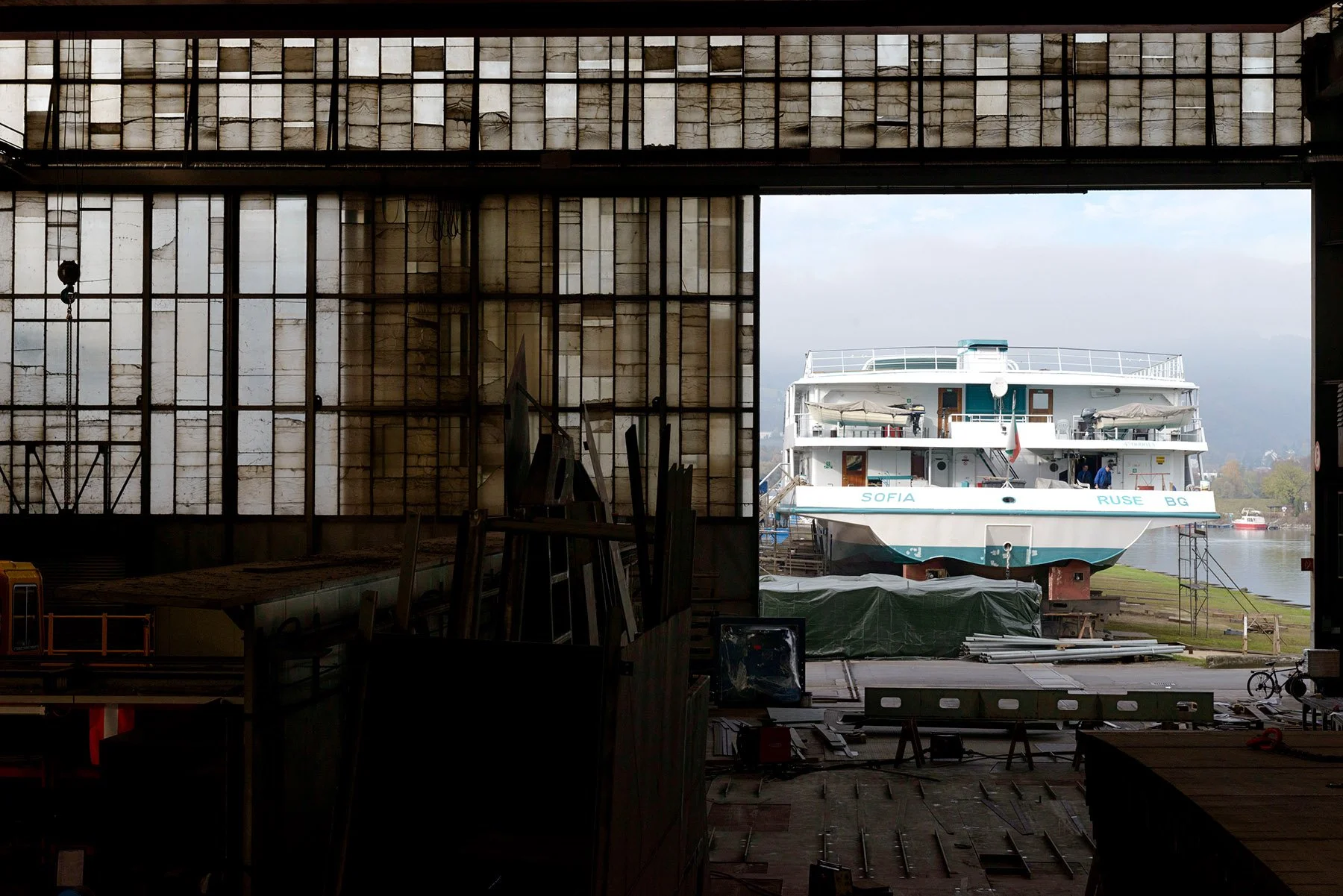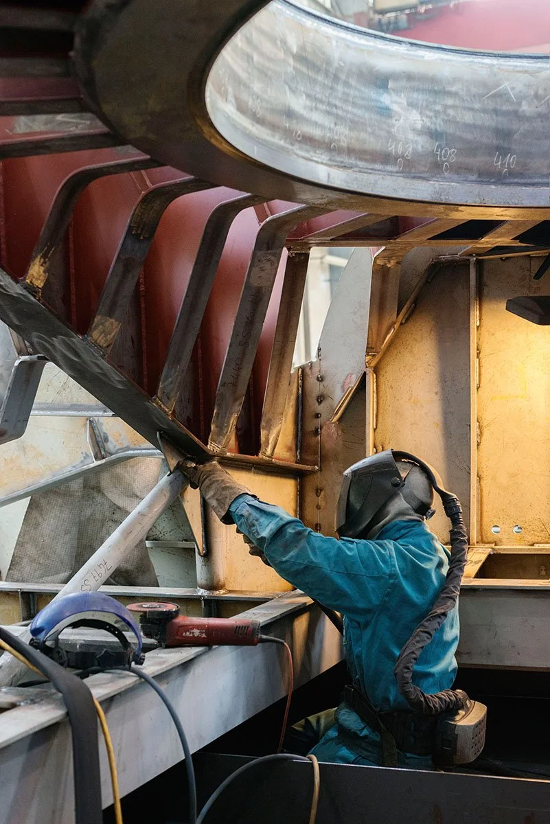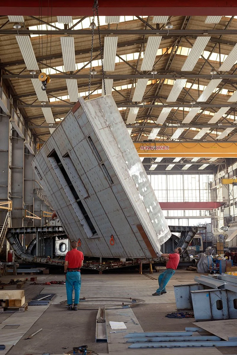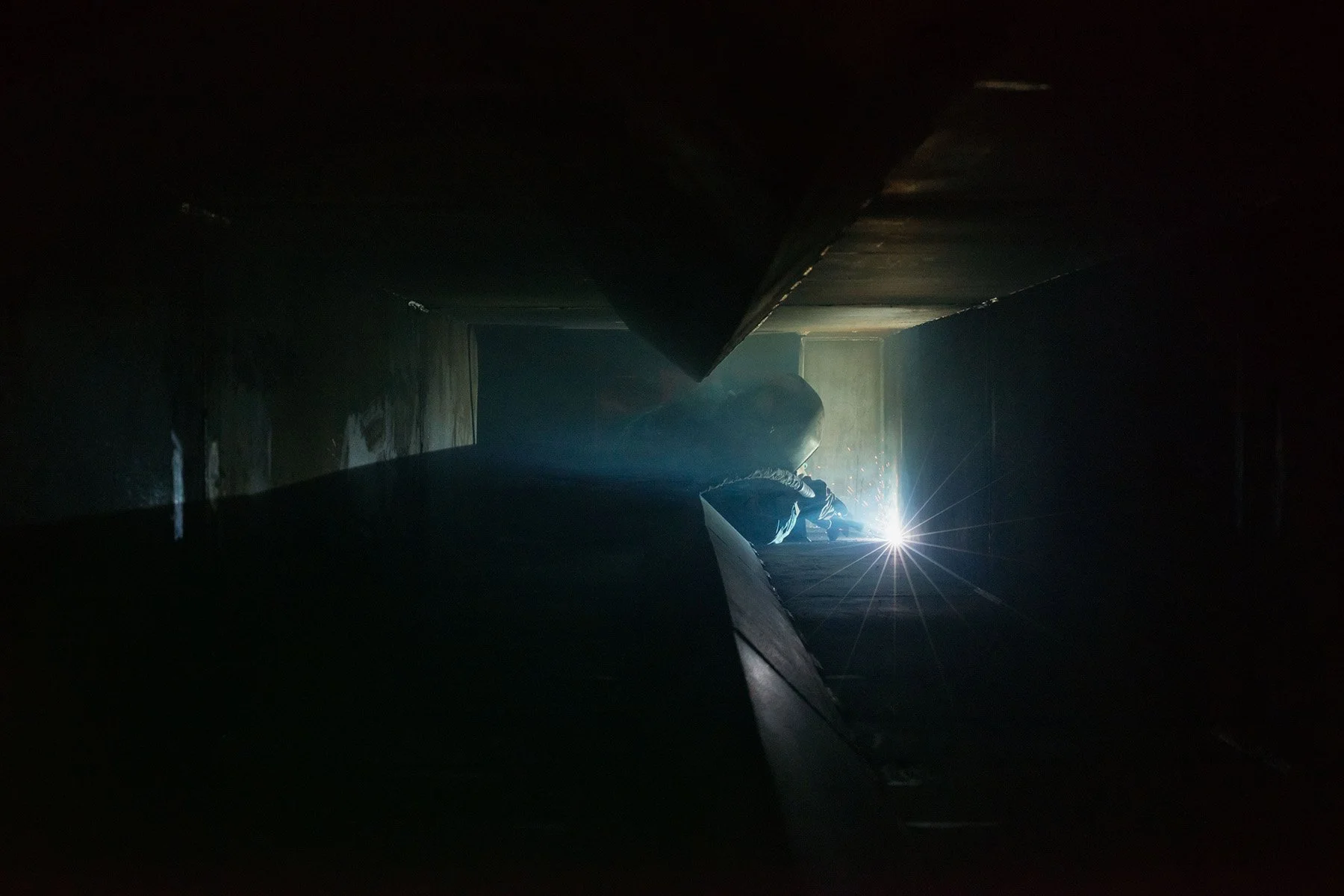 The series shows an artistic exploration of the company over a span of one and a half years which involves the construction of a new sea ferry among other things. I often began the shift in the early morning with the workers and accompanied them throughout their workday. After having been on site almost daily during the first two months, I began to shoot at larger intervals and outside regular working hours. At nighttime and on weekends when the halls stood empty, the premises transformed into a nature reserve along the Danube, a haven for mariners and wildlife alike. The sensuality of the place is also impressive on workdays, when the noise of the machines is amplified by the large halls, metal dust glistens, and the smell of hot metal lies in the air.