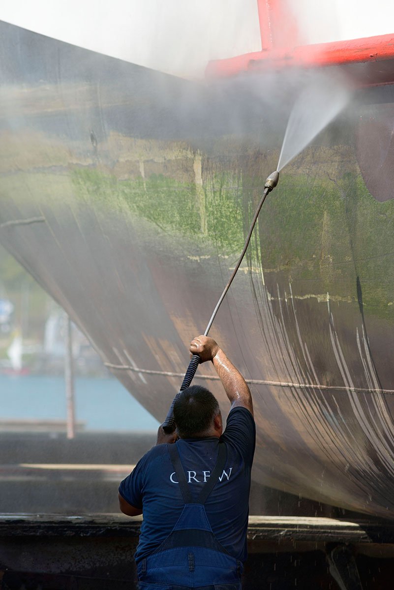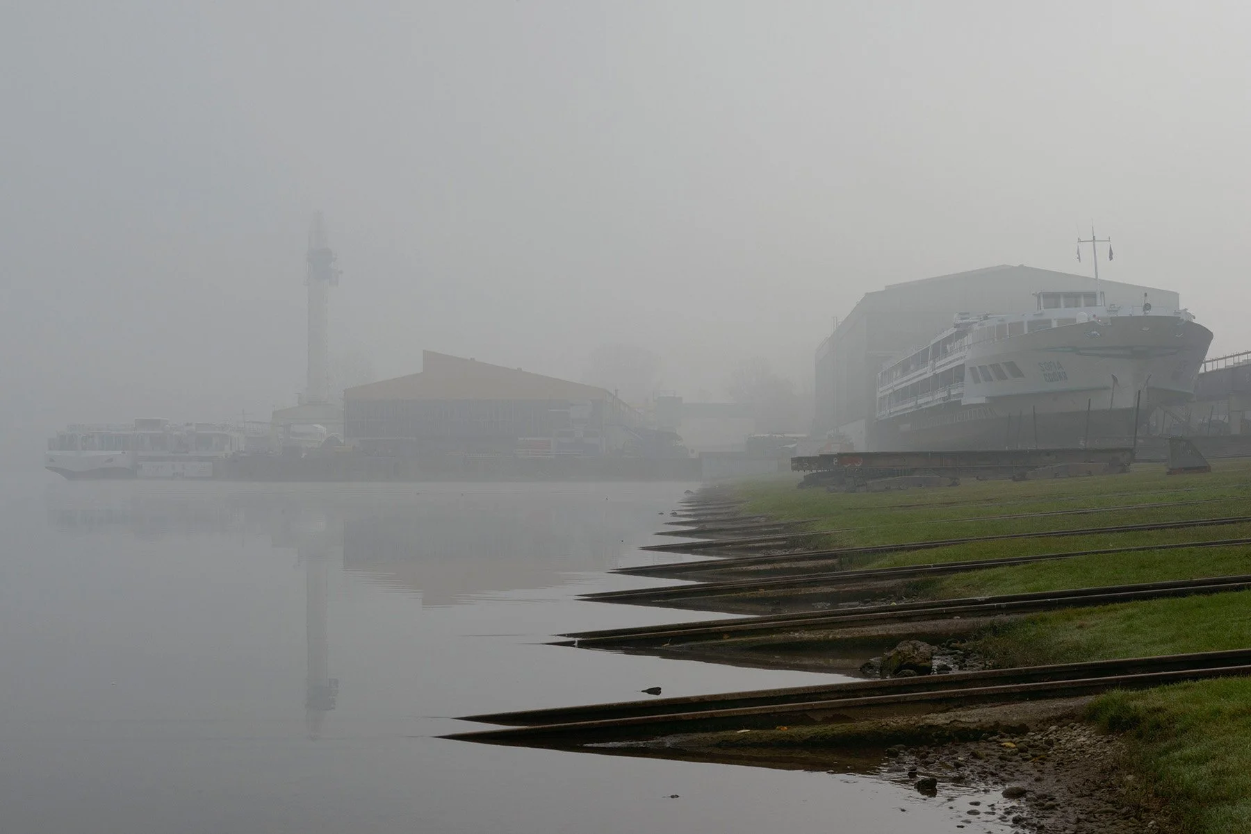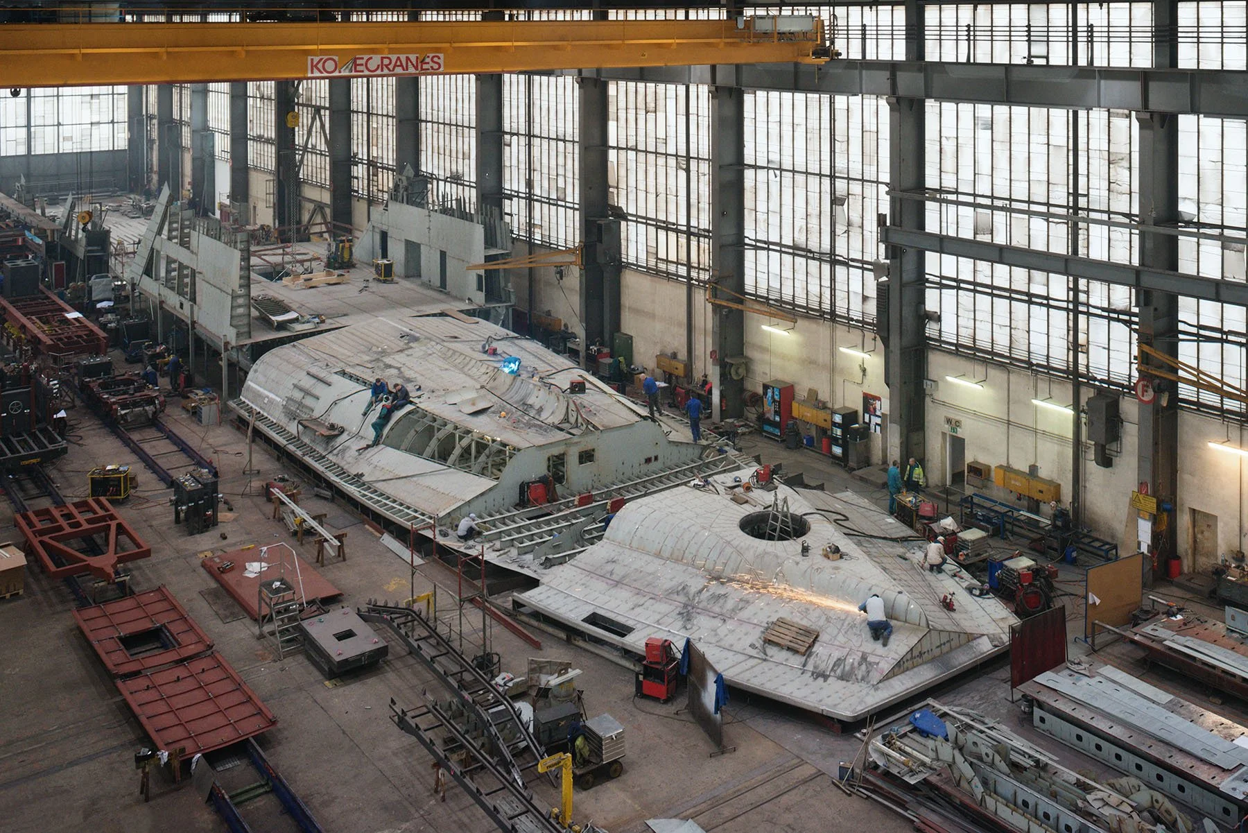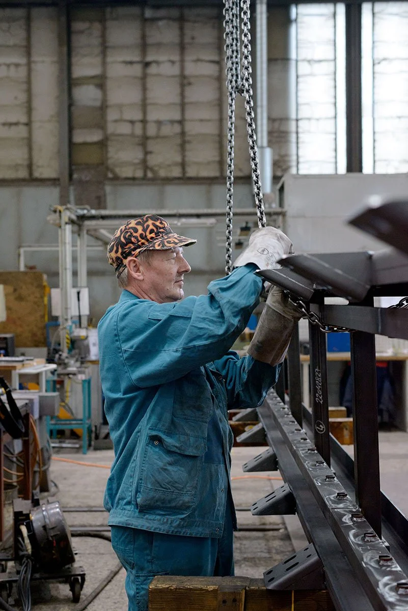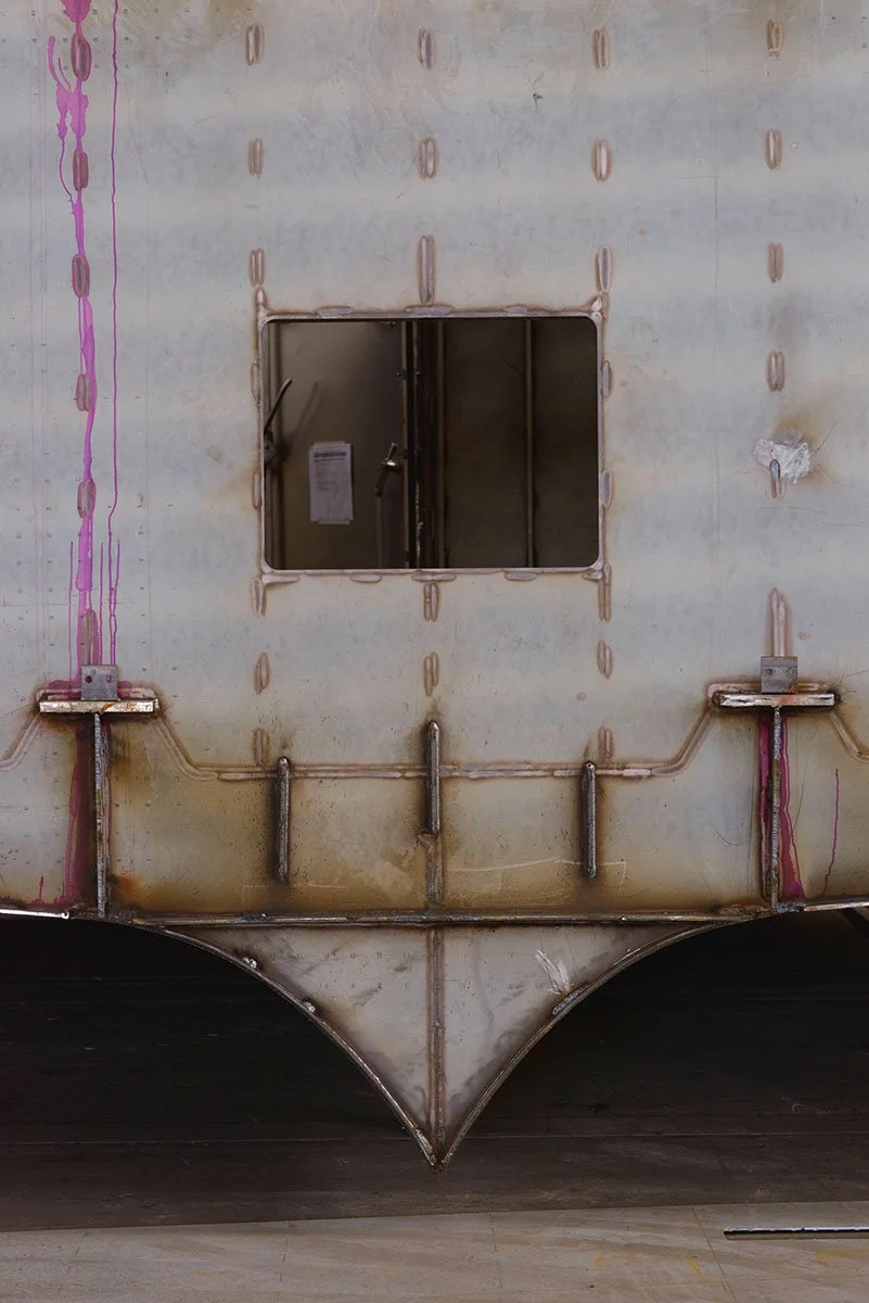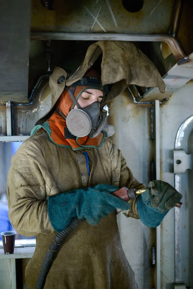 The series shows an artistic exploration of the company over a span of one and a half years which involves the construction of a new sea ferry among other things. I often began the shift in the early morning with the workers and accompanied them throughout their workday. After having been on site almost daily during the first two months, I began to shoot at larger intervals and outside regular working hours. At nighttime and on weekends when the halls stood empty, the premises transformed into a nature reserve along the Danube, a haven for mariners and wildlife alike. The sensuality of the place is also impressive on workdays, when the noise of the machines is amplified by the large halls, metal dust glistens, and the smell of hot metal lies in the air.