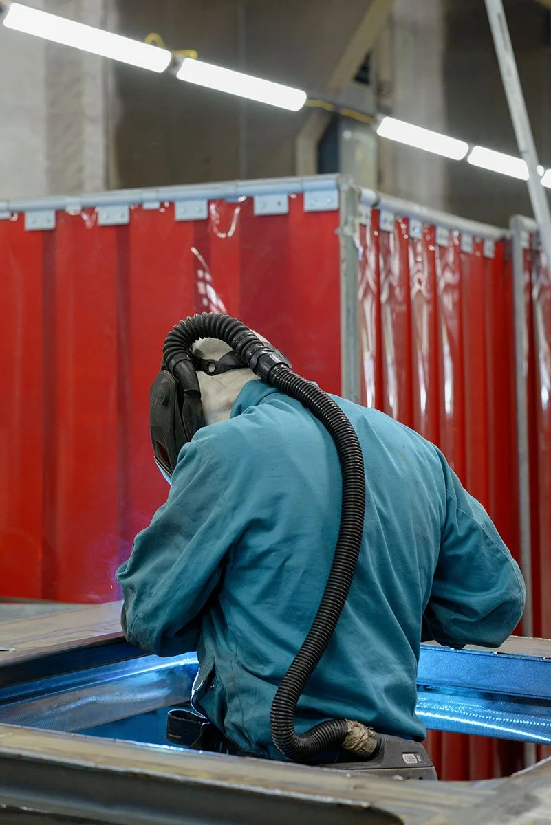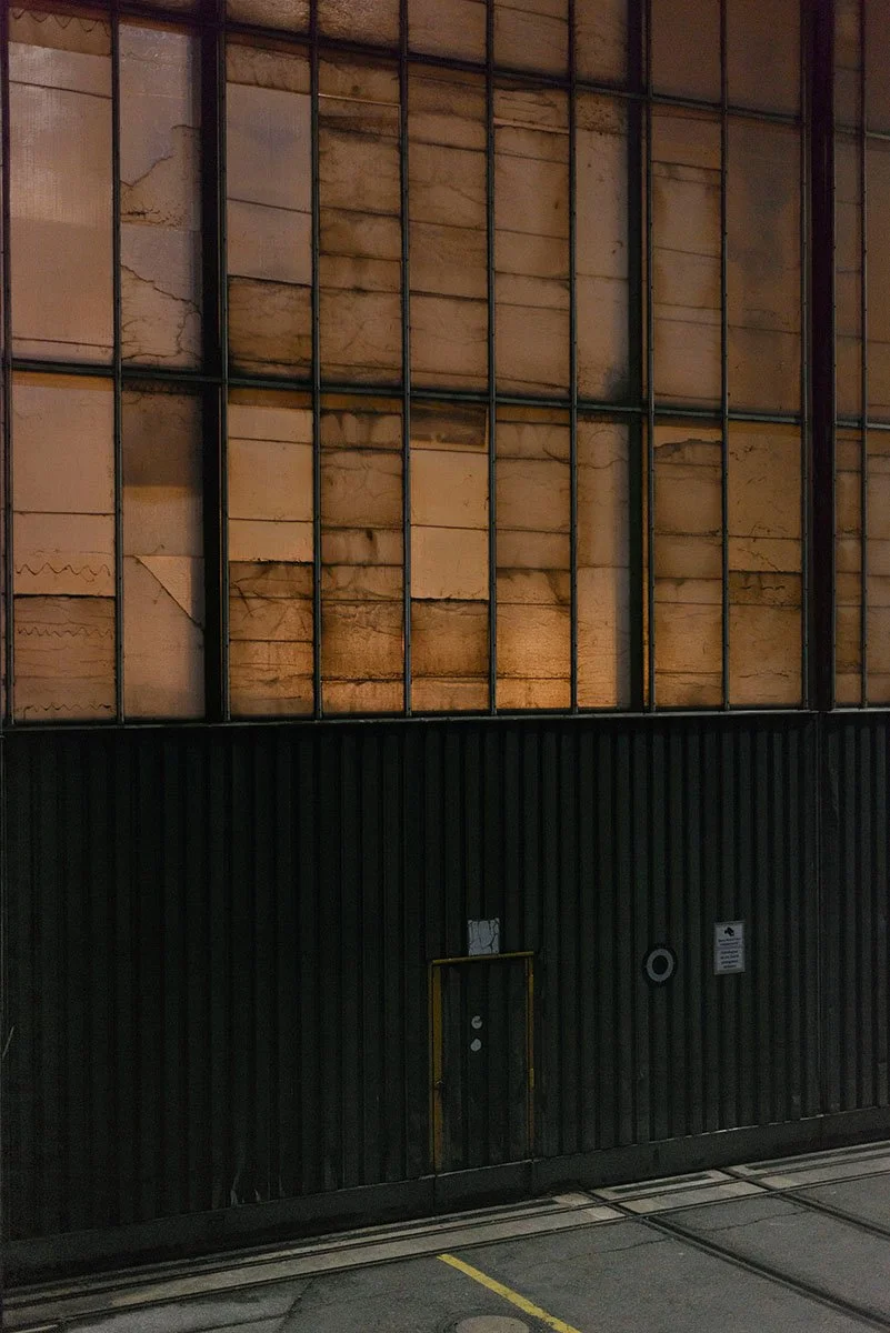 The welding shields that protect the workers from the aggressive light have photographic qualities. The red color, the transparency, and the shielding function are something they have in common with photographic tools such as the red filter or the red light in the darkroom that respectively filter or screen light out, just as the welding curtains do. As a connective element to photography and like a stage curtain that emphasizes the fictional aspect of the medium, the red welding shields pervade the series and the book.