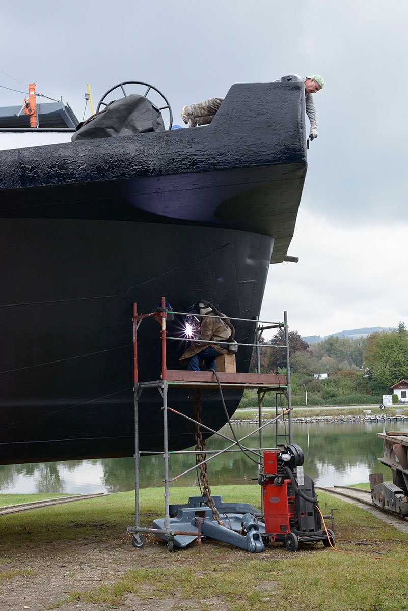 The photo series Bodies of Work was created in the last Austrian shipyard on the Danube, the ÖSWAG, which carries out repairs as well as builds new steel ships. It is located in the winter harbor in Linz. In the two distinct areas, “machine engineering” and “wharf,” highly technological machine-based production and industrial manual labor are tightly interwoven. Artistically engaging with an industrial production site that centers around a large workpiece – a strongly division-based manufacturing process that a large number of people contribute to – is appealing in times of great change in the vocational field and the increase of immaterial labor. Today, industrial forms of labor that are not fully automated are often falsely seen as outdated and fall out of public perception. For this reason, we tend to forget how much manual labor is still embedded in the process of industrial production. Predictions of a de-industrialization based on the belief that these forms of work have already been outsourced into threshold countries only further reinforce this disappearance from the public eye. This may partly explain the astonishment of a lot of people who would not expect a wharf in this location, also because of the image of Austria as a mountainous landlocked country.