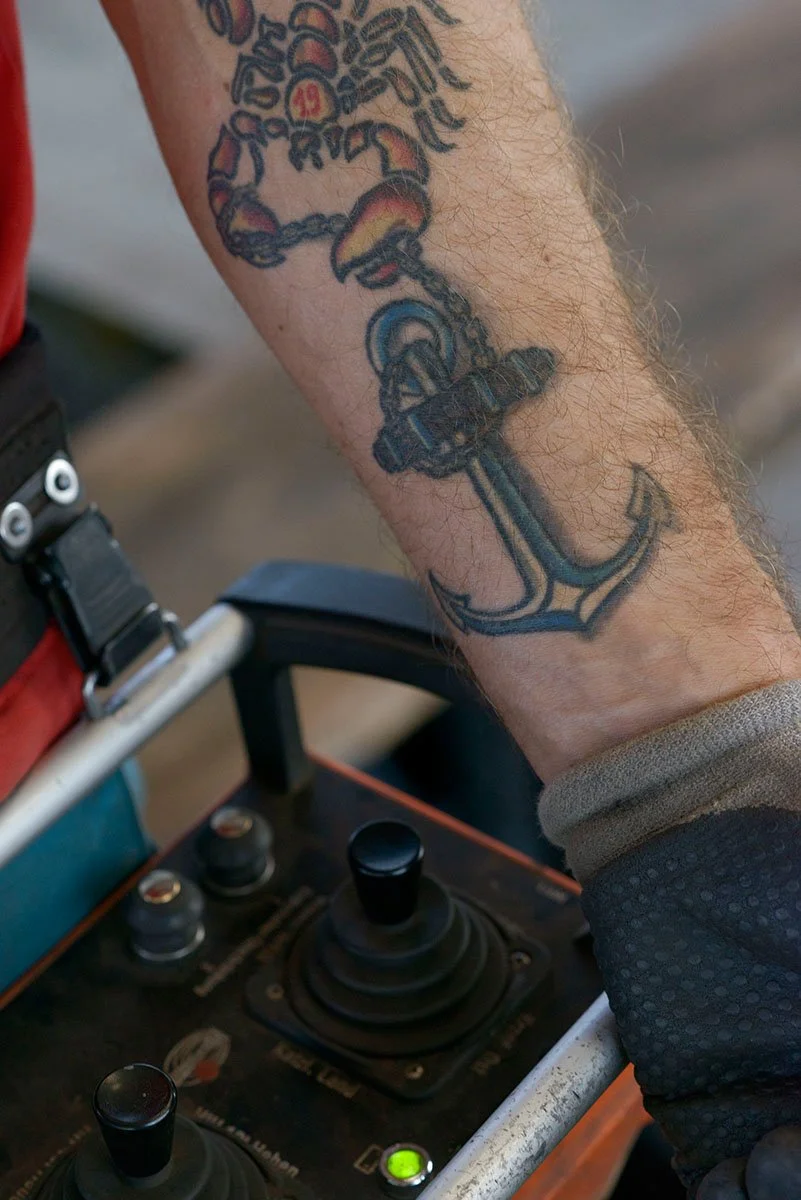 In the wharf we witness interesting temporal entanglements. The anachronistic qualities of this place become apparent when a factory siren announces and ends the breaks from work, and are further reinforced by the connotations of manual labor on ships and the close connection of humans and machines. In many cases the almost 180-year-old history of the company shines through and provides flashbacks to a fluctuating past.