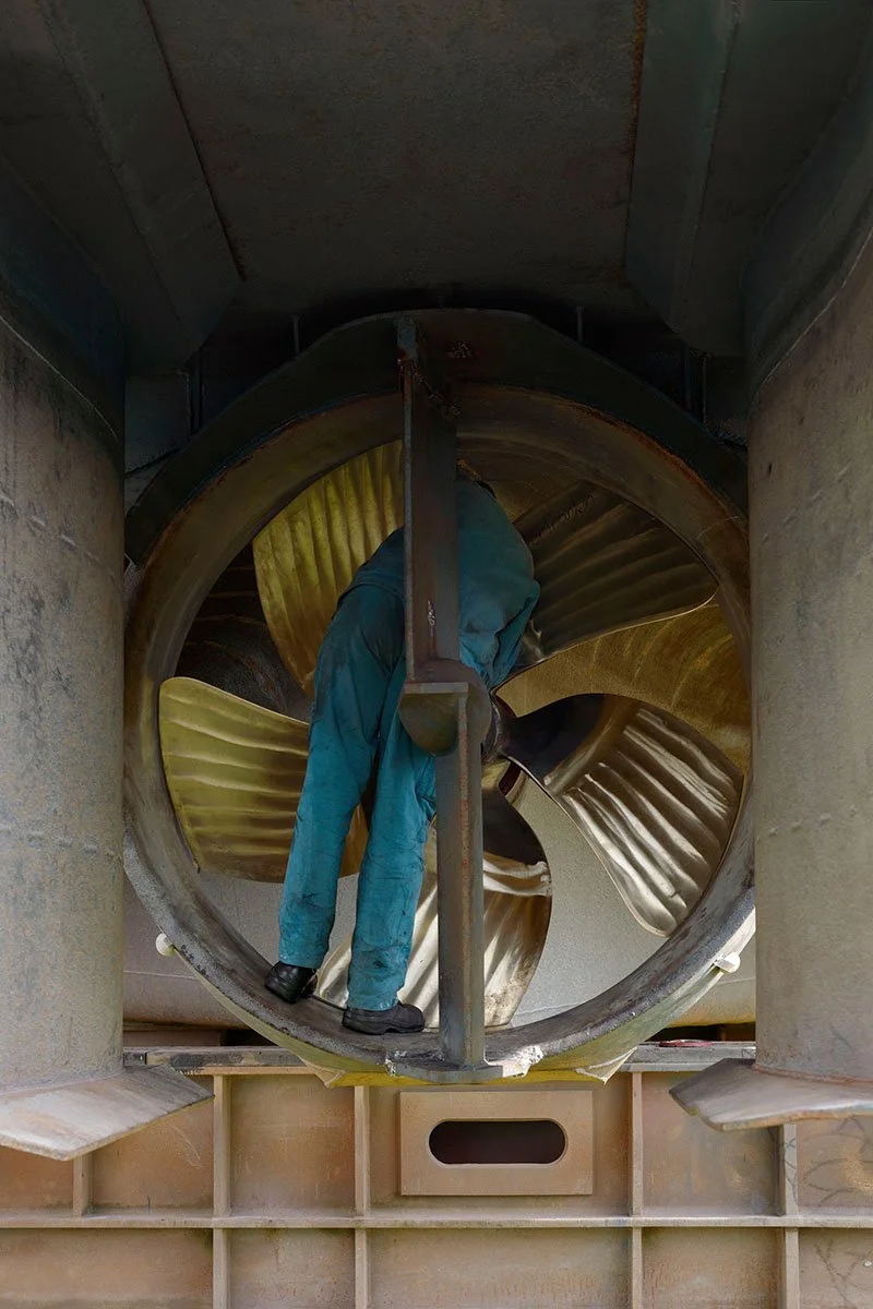 Yet the wharf also allows for leaps into the future when images of the ship’s hull from a heightened perspective bring to mind associations of science fiction spaceships, their designs inspired by the aesthetics of the manufacturing industry. In their protective gear, the welders are transformed into space travelers whose air supply is pumped into their helmets through tubes. Picking up on the analogies of the protective gear and space suits as well as the motif of the (space) ship as a symbol for adventure and discovery – but also for escape – provided the means to uncouple the specific place of the wharf and in some instances photographically remove it from gravity in order to reach another level of meaning.