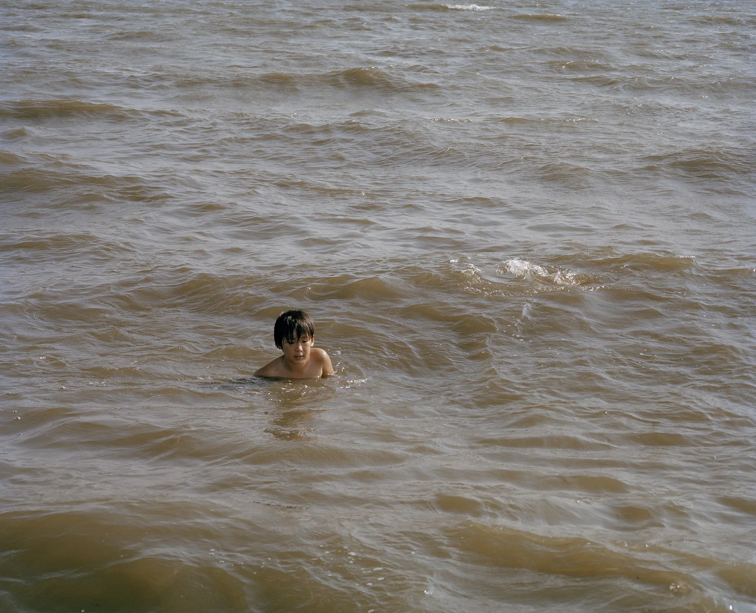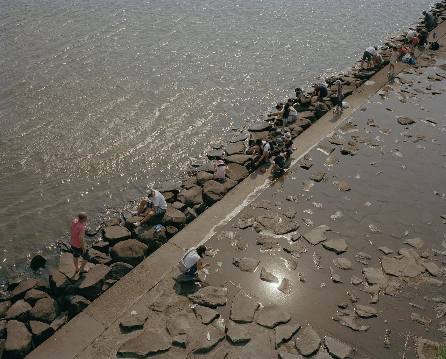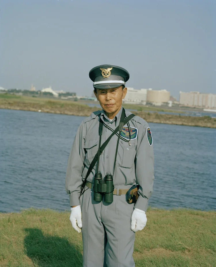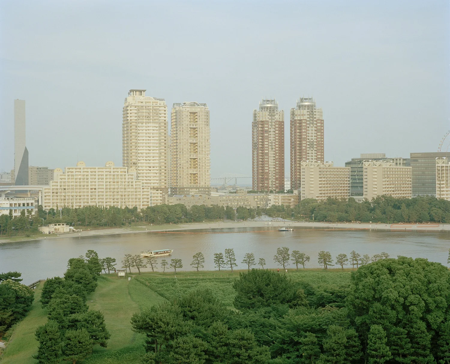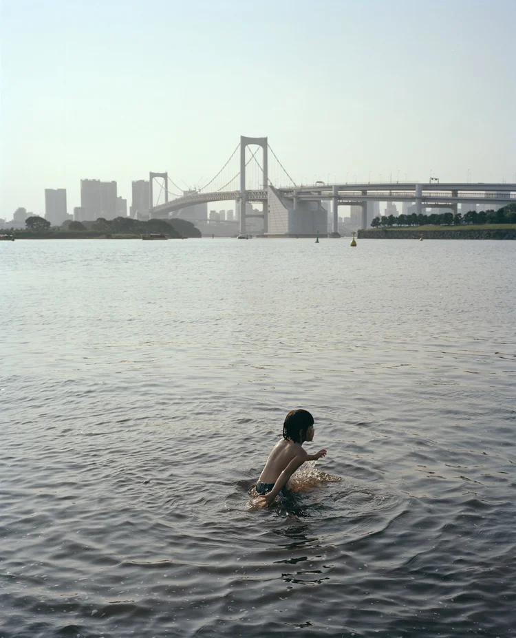 Gruzei‘s photo series shows the absurd-looking urban bathing landscapes under the haze of the city. In the images, views of canal-like seawalls alternate with bathing panoramas against high-rise backdrops. The series depicts a little-known facet of life in Japan‘s capital. Isolated people bathing seem to contradict the established visual canon of densely packed commuters in public transportation or on the streets. commuters in public transportation or on the city‘s crosswalks.