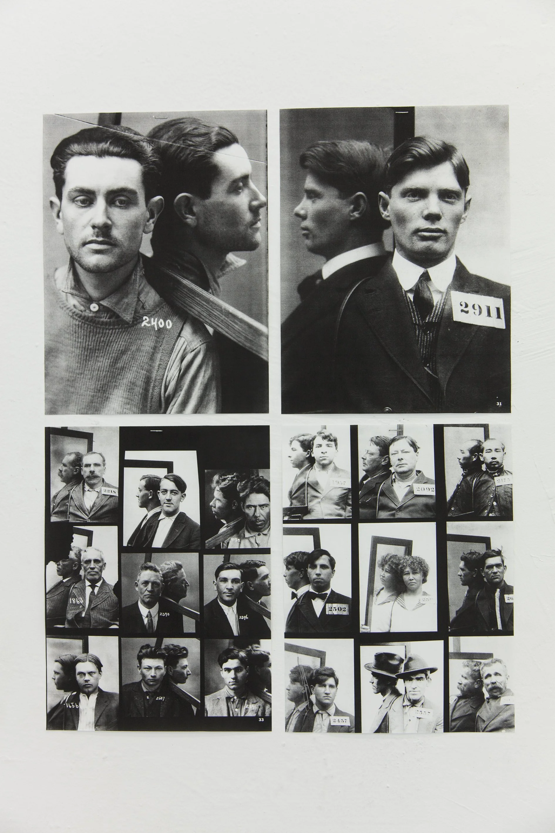 For her photographic mirror object, Katharina Gruzei takes as her starting point from photographs of an American police archive that she discovered in a book. The pictures show alleged criminals in front and side view, the so-called ‘mug shot’. What is special about them is that the people photographed were not photographed twice, as is usually the case. Instead of the two shots from the front and side, these people have shouldered a mirror that shows the face from both sides. The artist assumes that this is a creative measure to save money by only using up one negative per arrested person.