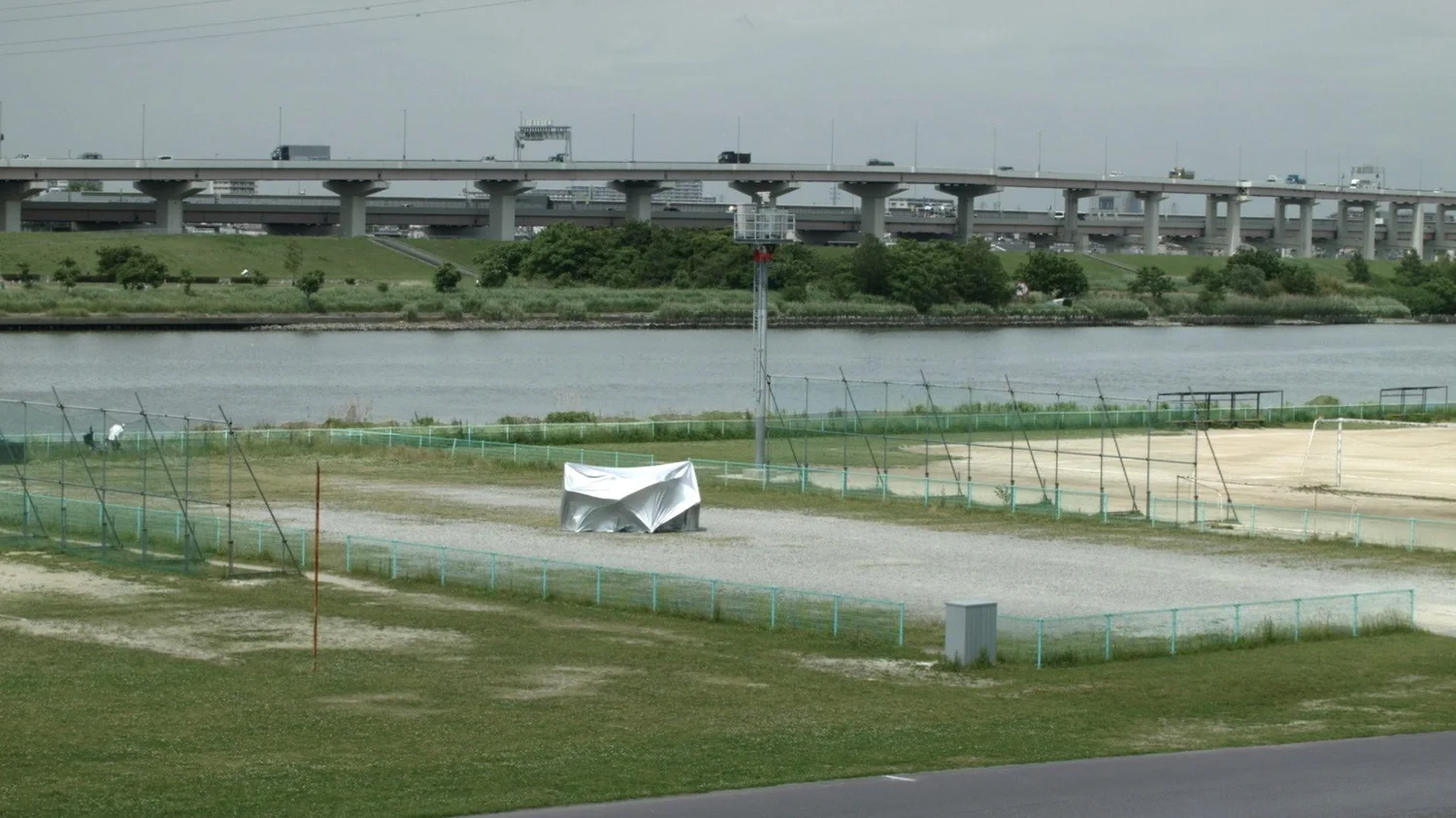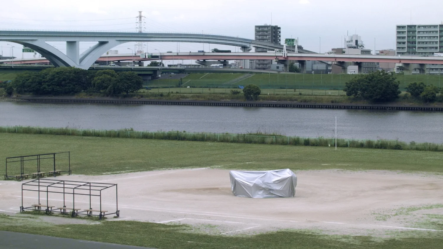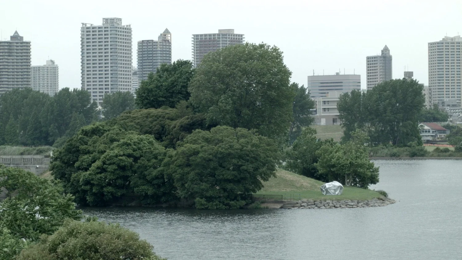 The establishing shot of the video shows a densely built urban landscape, which is contrasted by a concrete and fenced open space in the foreground. The area around a river in Tokyo is the scene of a strange phenomenon. An indefinable silver mass begins to move and seems to inflate from within. The wafting sculpture, which at times reminds of an organic body, then again acts like an architectural element, grows and in the next scene decays again to a small wrinkled accumulation on the ground. The erection and collapse of this foil takes us to four places whose apocalyptic mood is enhanced by sound. Silver foils that are used for covering cars, bikes and motorcycles are commonly seen in the streets of Tokio. Urban Reflectors picks up on this appearance and the Japanese culture of wrapping and packing, which can also be read as an act of caring. Being part of the everyday life in Tokio, the intervention in public space is only discovered by few passersby.