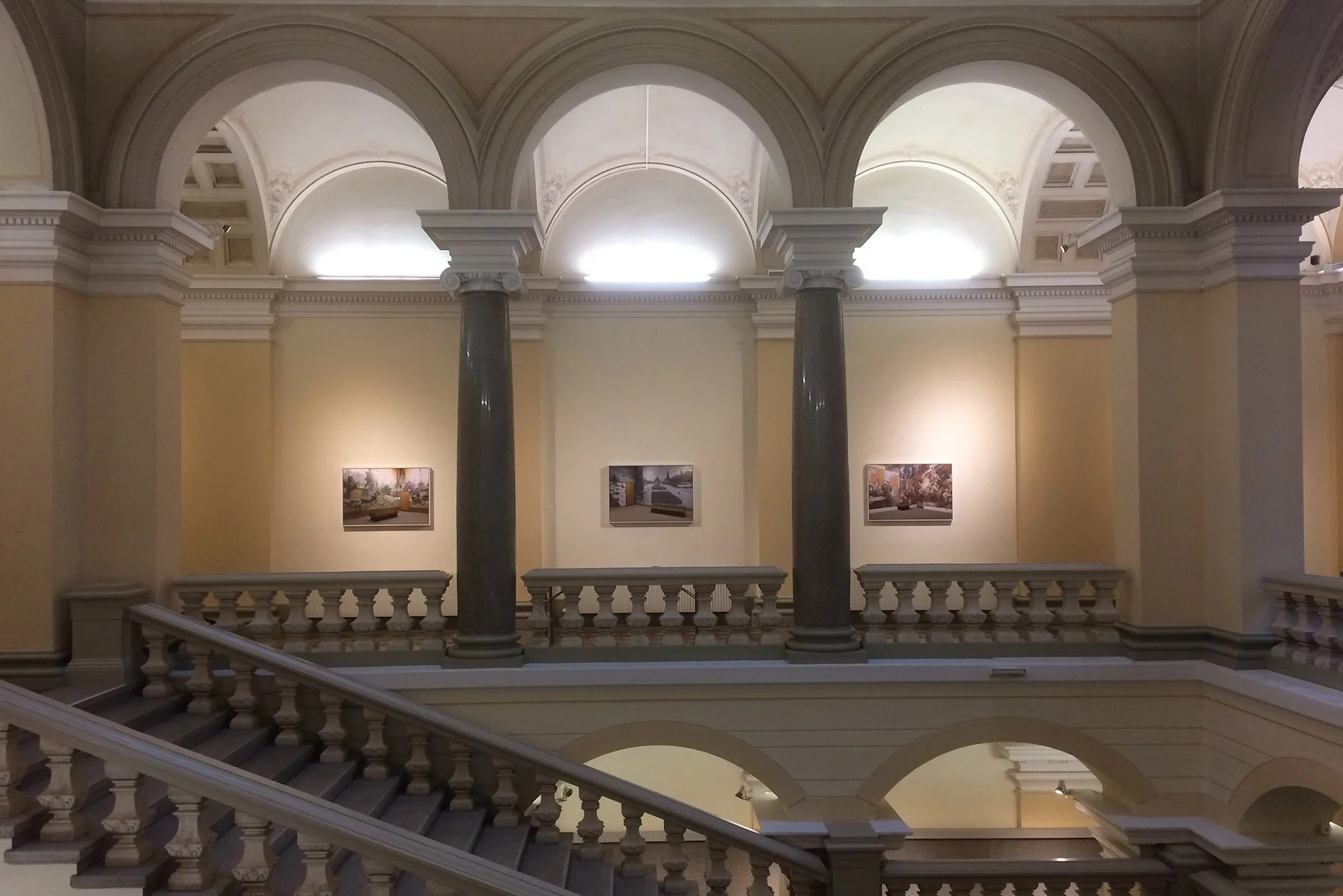 Wallpaper Installation, dimensions variableThe Museum of the Great Patriotic War in Moscow presents large-format dioramas in six rooms, portraying the most important events of World War Two for Russia. Realized in the 1990s by artists from the Grekov Studio, the wall paintings are not limited to the semi-circular war panoramas, but also continue on the adjacent walls of the rooms. Apart from the areas with the large display theaters, the depictions of war enter into a bizarre dialogue with the functional level of the museum. Unlike the immersive dioramas, where visitors are supposed to find them- selves in the midst of the battlefield, here the effect of the images is inverted. Real objects accidentally disrupt the rhetorics of the heroic murals, allowing museum gestures to become visible. Within the painted battlefields there are switches, buttons, conduits, electrical sockets, and doors. They break with the pictures on the walls, and as indications of the functional structure, they reveal museum strategies of staging: the use of painting as an artistically charged form of picturing war with a technical boost of sound and light effects. Documentary photo- graphs of World War Two, which named the original horror, served simply as a reference for developing melodramatic war tableaus.
