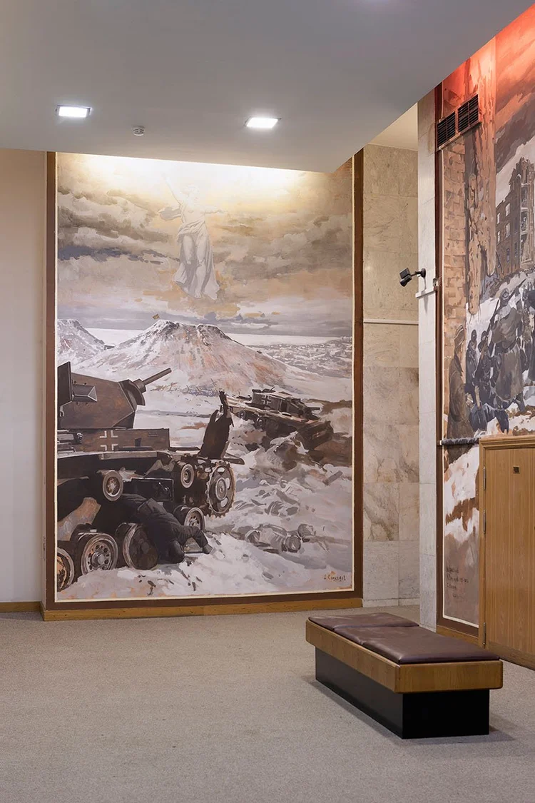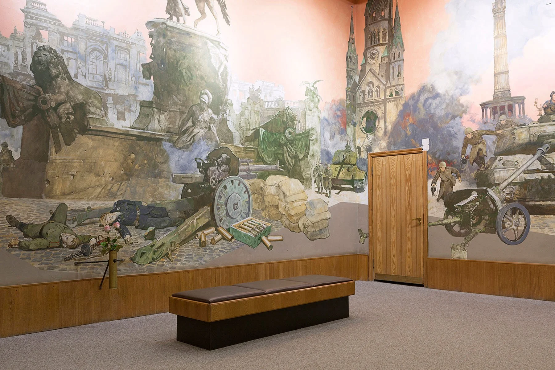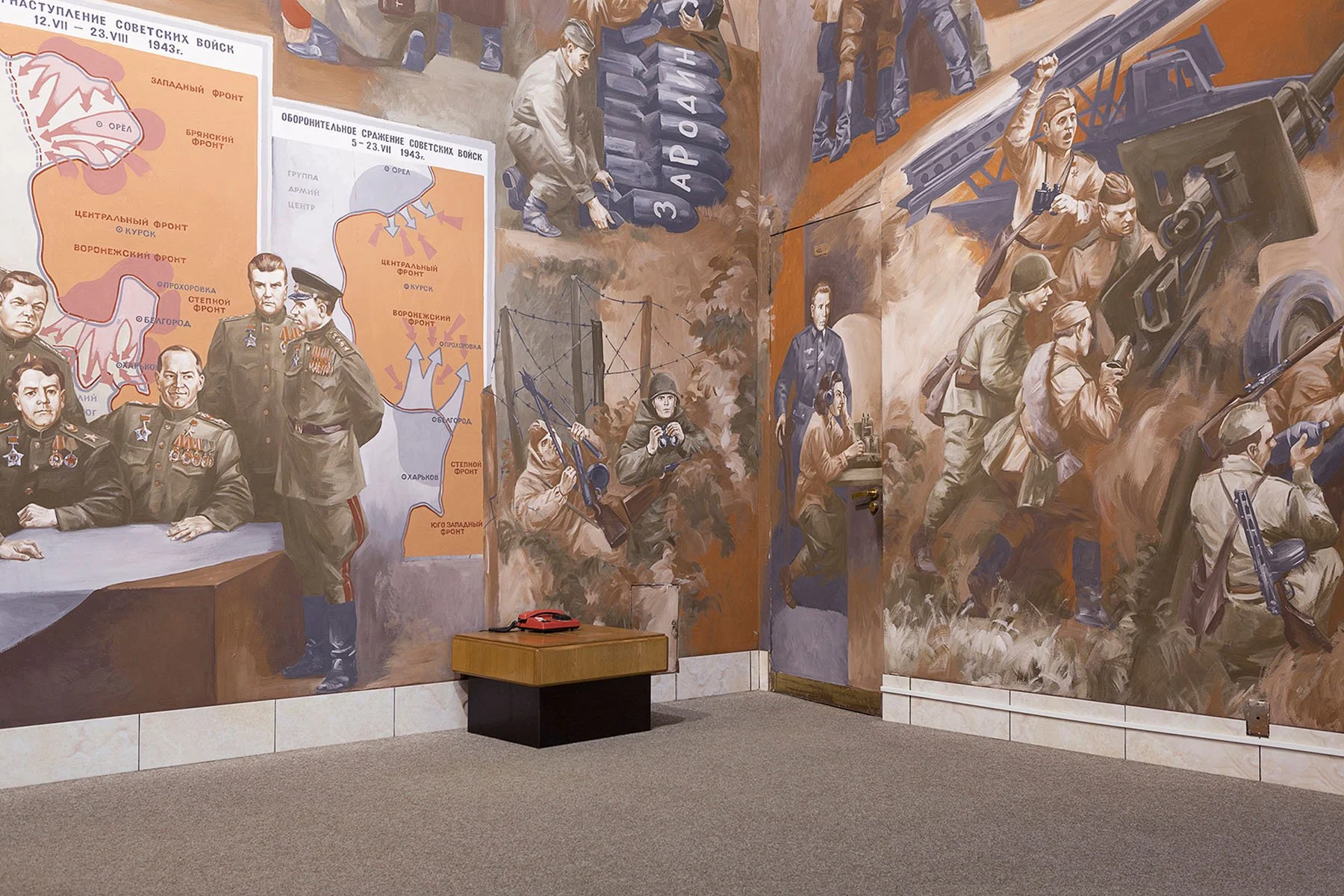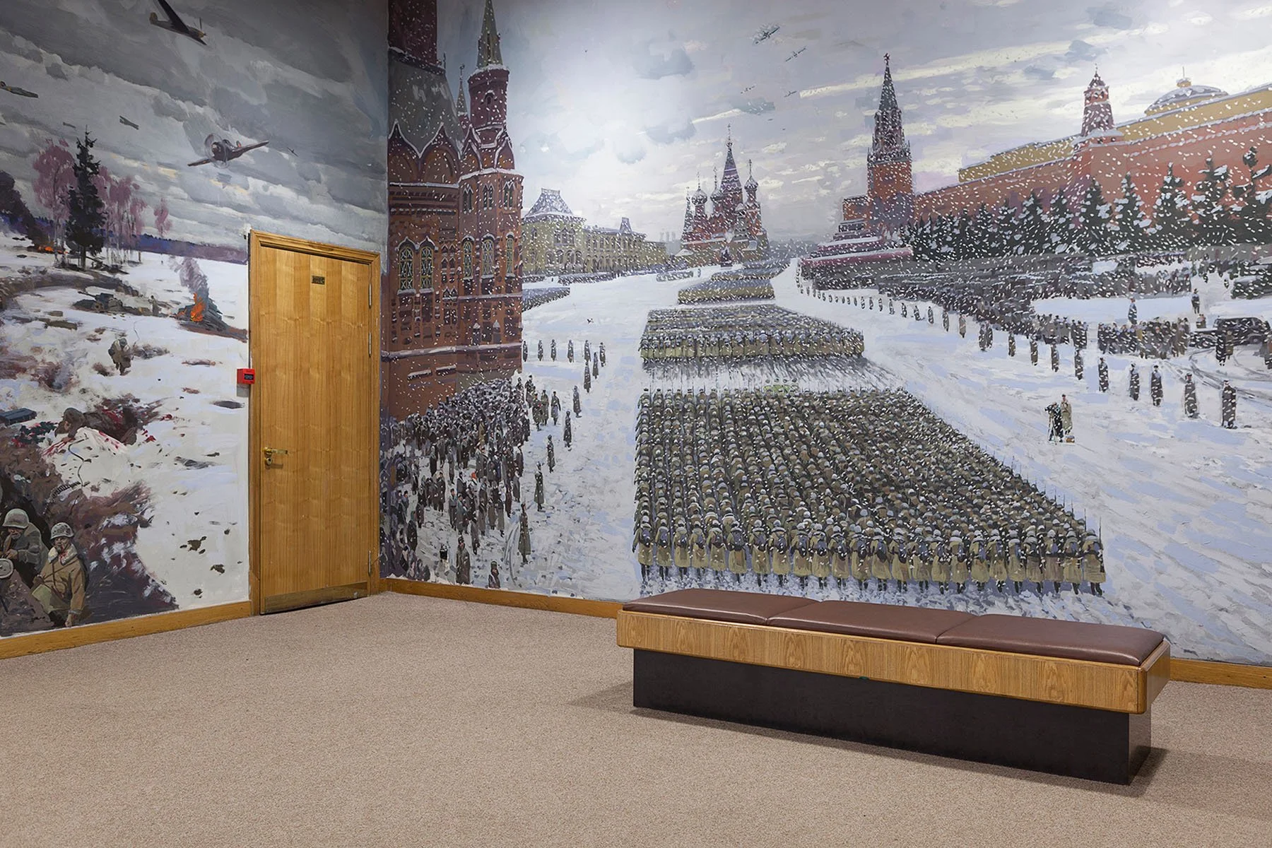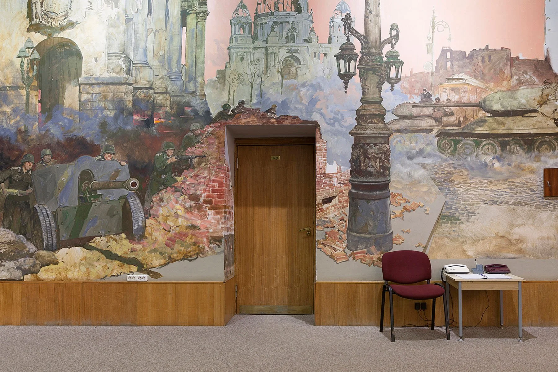The Museum of the Great Patriotic War in Moscow presents large-format dioramas in six rooms, portraying the most important events of World War Two for Russia. Realized in the 1990s by artists from the Grekov Studio, the wall paintings are not limited to the semi-circular war panoramas, but also continue on the adjacent walls of the rooms. Apart from the areas with the large display theaters, the depictions of war enter into a bizarre dialogue with the functional level of the museum. Unlike the immersive dioramas, where visitors are supposed to find them- selves in the midst of the battlefield, here the effect of the images is inverted. Real objects accidentally disrupt the rhetorics of the heroic murals, allowing museum gestures to become visible. Within the painted battlefields there are switches, buttons, conduits, electrical sockets, and doors. They break with the pictures on the walls, and as indications of the functional structure, they reveal museum strategies of staging: the use of painting as an artistically charged form of picturing war with a technical boost of sound and light effects. Documentary photo- graphs of World War Two, which named the original horror, served simply as a reference for developing melodramatic war tableaus.