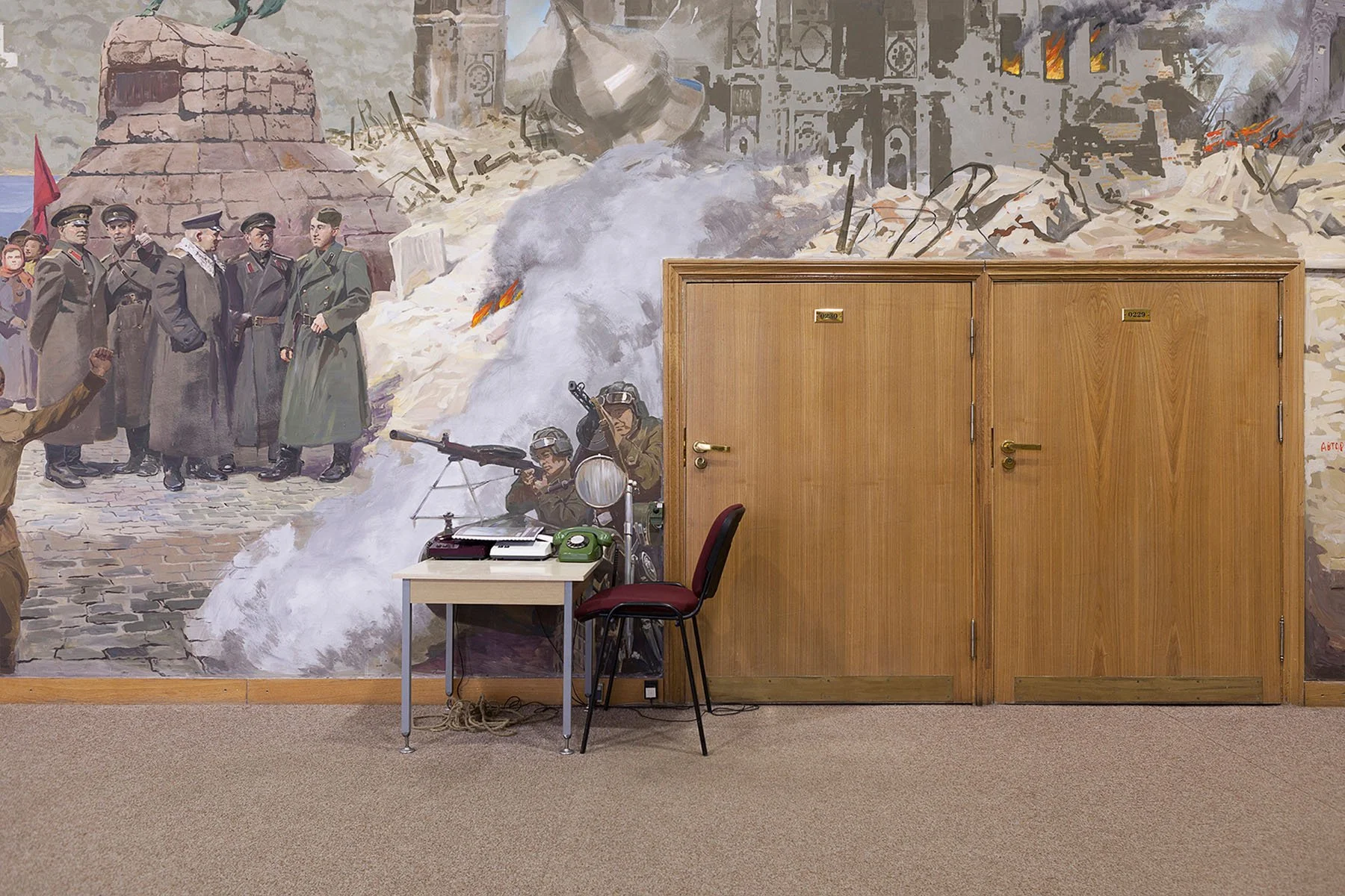 In the photo series WAR ROOMS, which shows the entrance and exit situations in the dioramas, there are further pragmatic objects that seem out of place and highly charged. Interiors, furnishings, and items of equipment become isolated and bizarre objects, although they correspond like stage props with their surroundings. They enter into a strange dialogue with the depictions of war: soldiers take cover behind a desk, military commanders seem to stare at a red telephone placed in the room. In another place it seems as though a soldier is shoveling rubble onto the chair of the museum staff. WAR ROOMS presents irritating scenarios to the viewers, in which inside and out- side space seem paradoxically interlocked. Doors integrated in the war paintings become an interface – a kind of portal that seems to open up the option of fleeing from war through the pictures. They suggest an emergency exit – for the protagonists of the battles as well as the visitors to the museum.